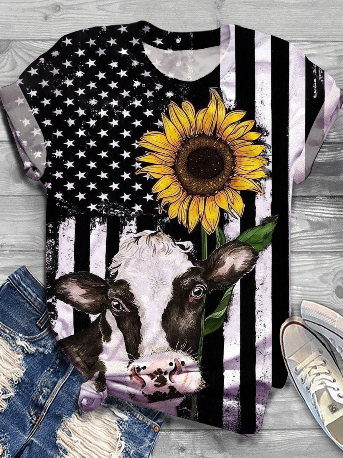 American Flag Sunflower Highland Cattle Crew Neck T-shirt