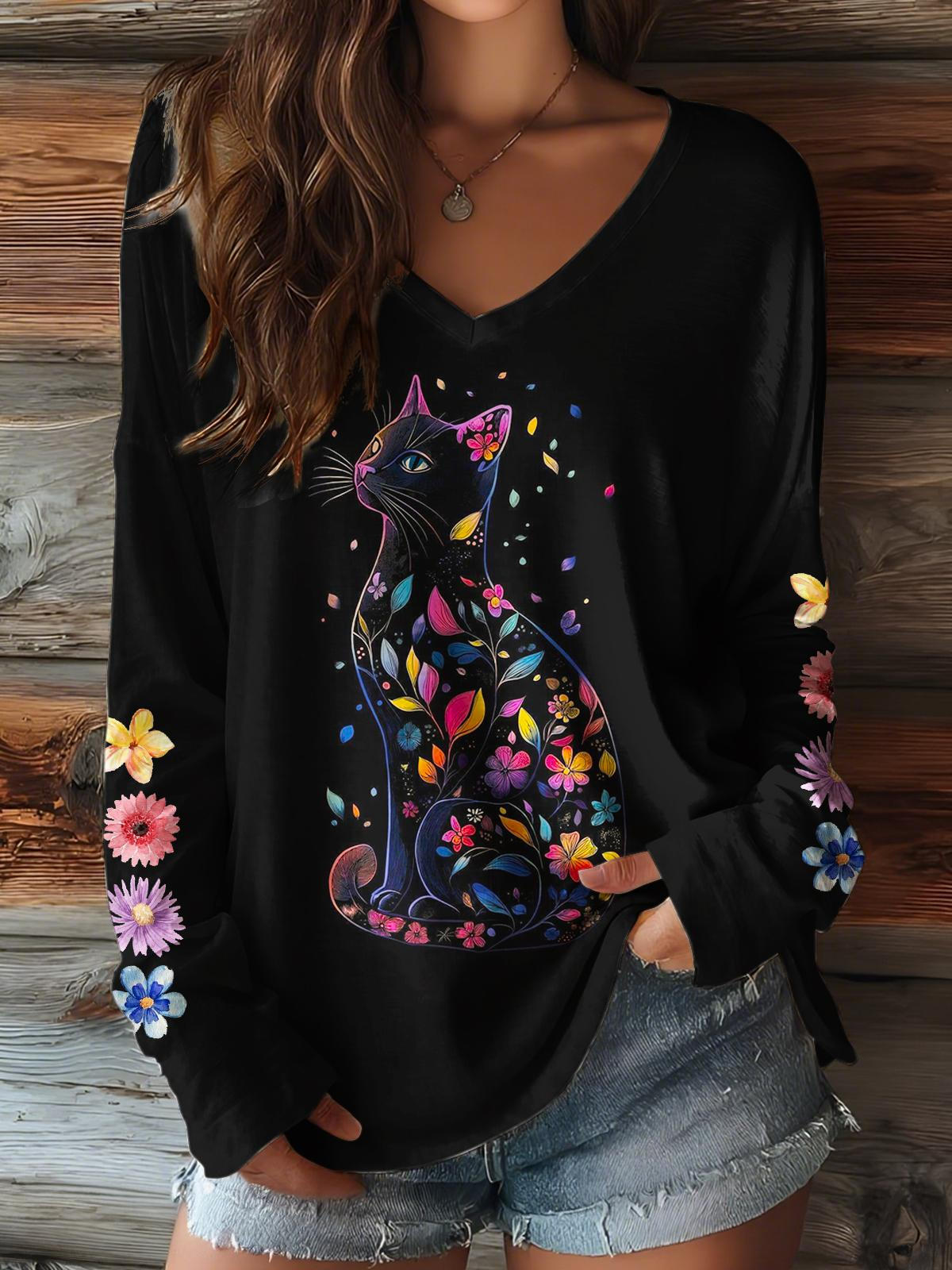 Autumn Floral Kitten V-neck Long Sleeve Top