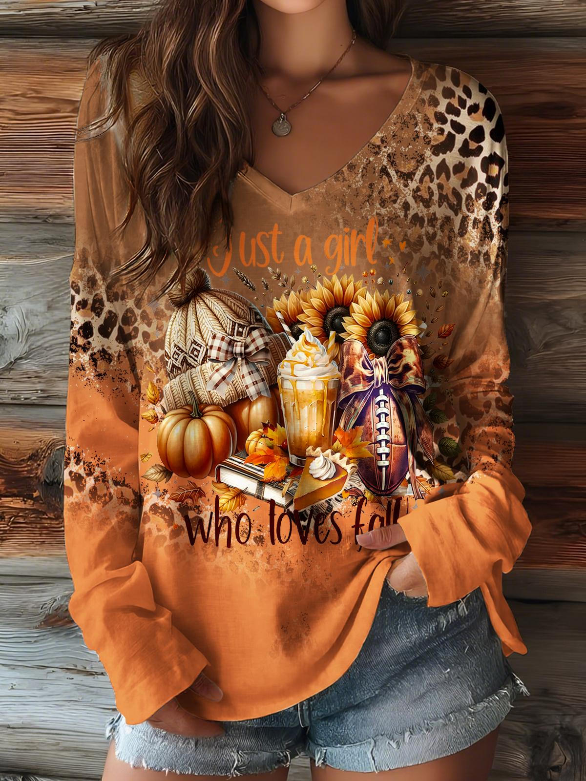 Autumn Pumpkin Leopard Print V-neck Long Sleeve Top
