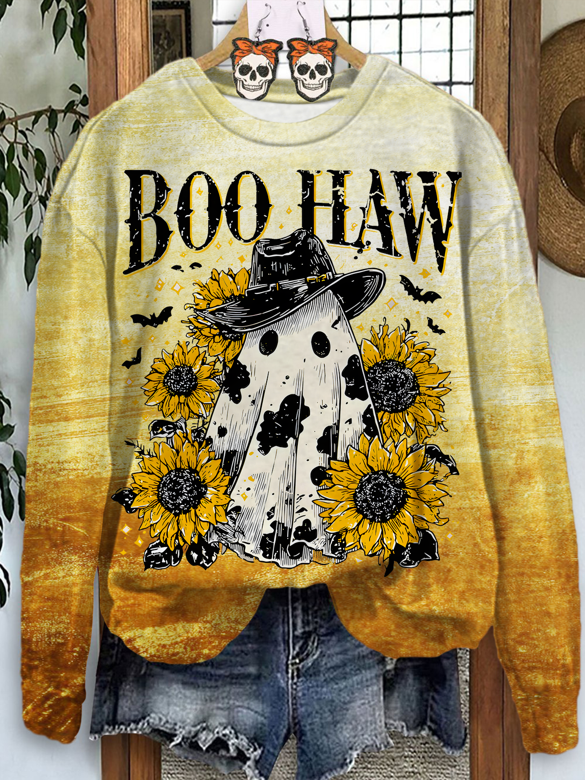 Autumn Sunflowers Boo Haw Printed Long Sleeve Casual Top