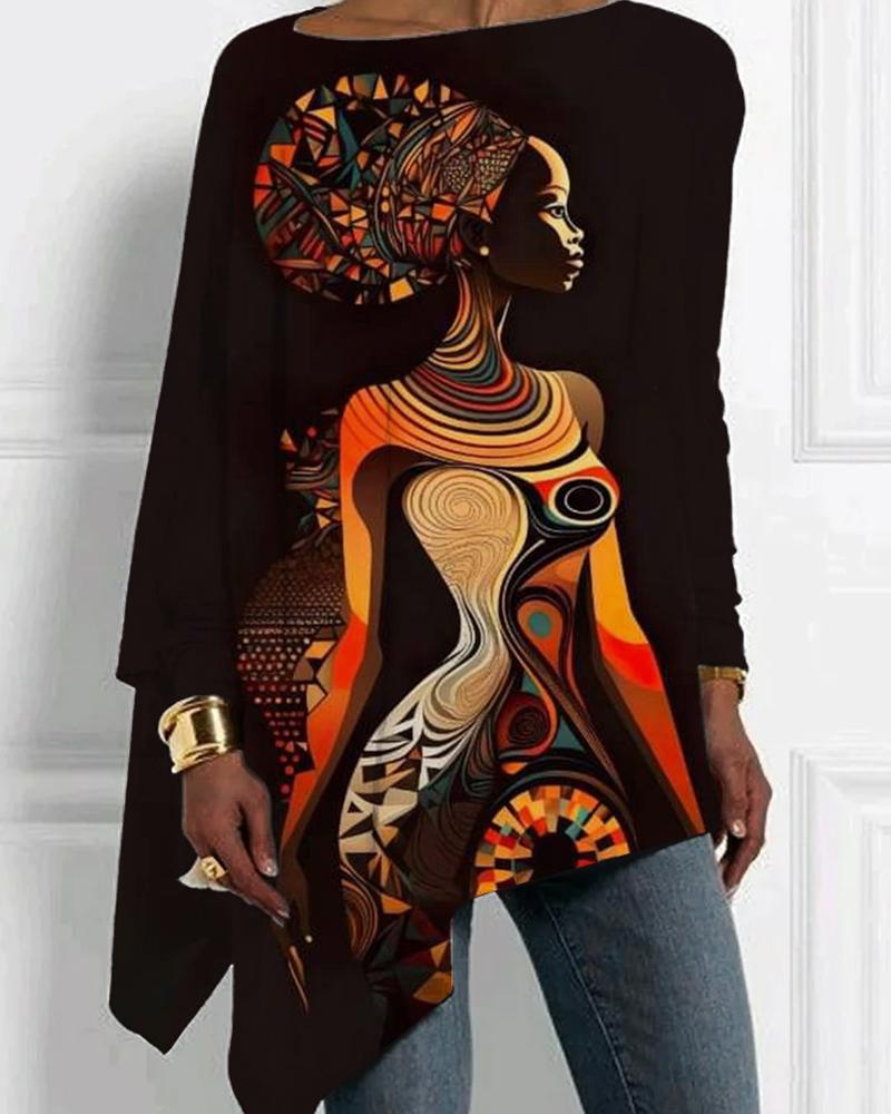 Black Ethnic Fashion Print Irregular Ladies Tops