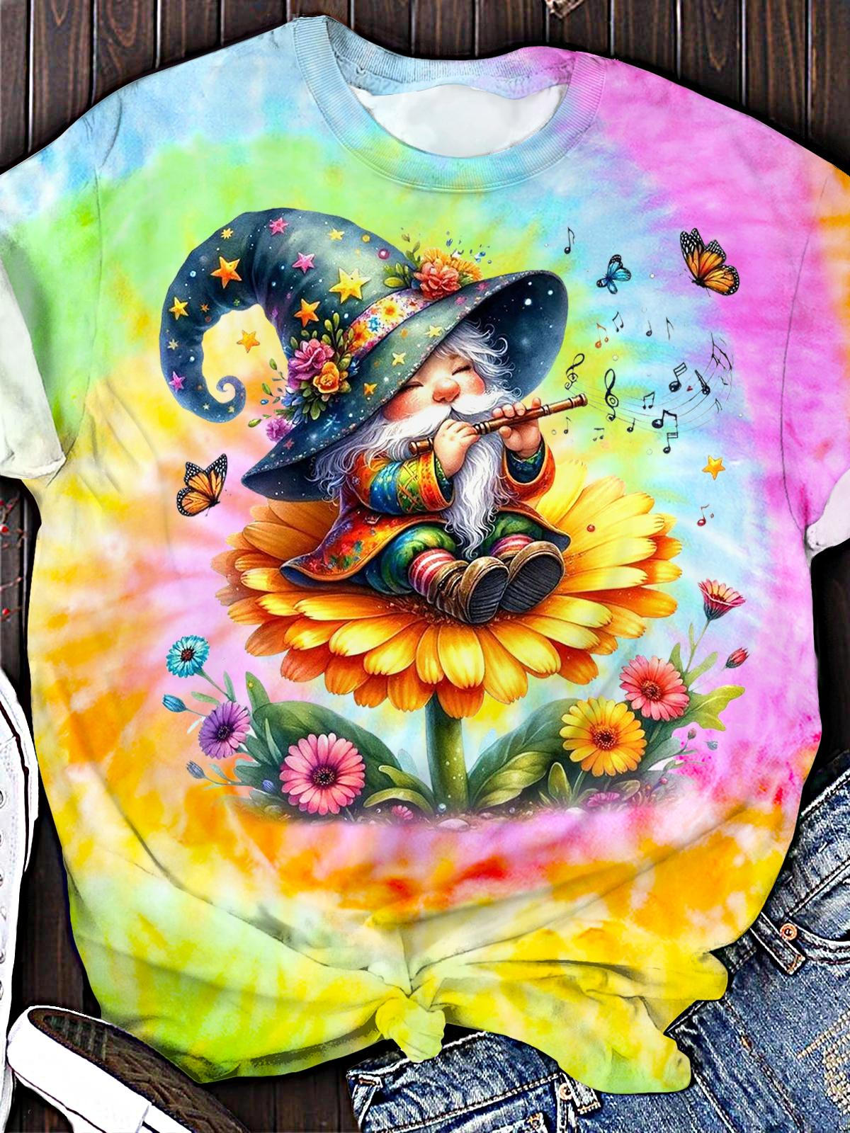 Colorful Sunflower Gnome Printed Crew Neck T-shirt