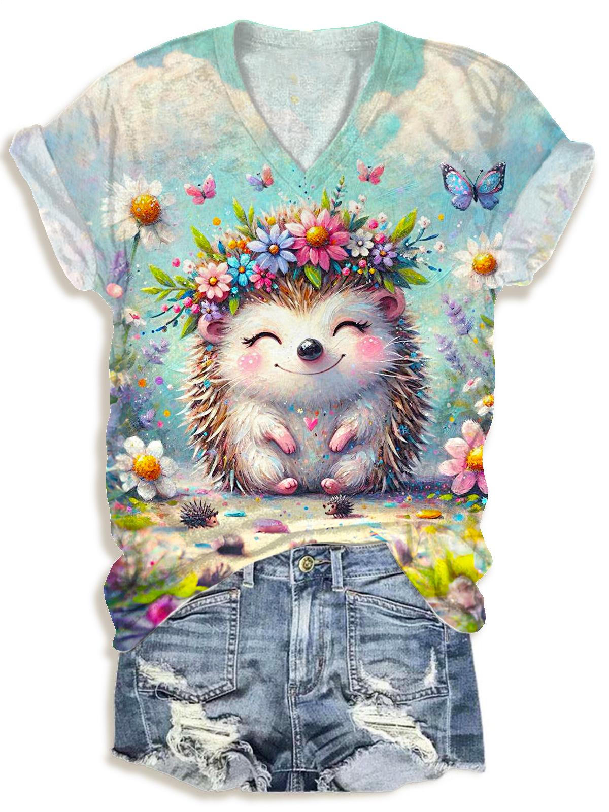 Cute Floral Hedgehog Print V-neck T-Shirt