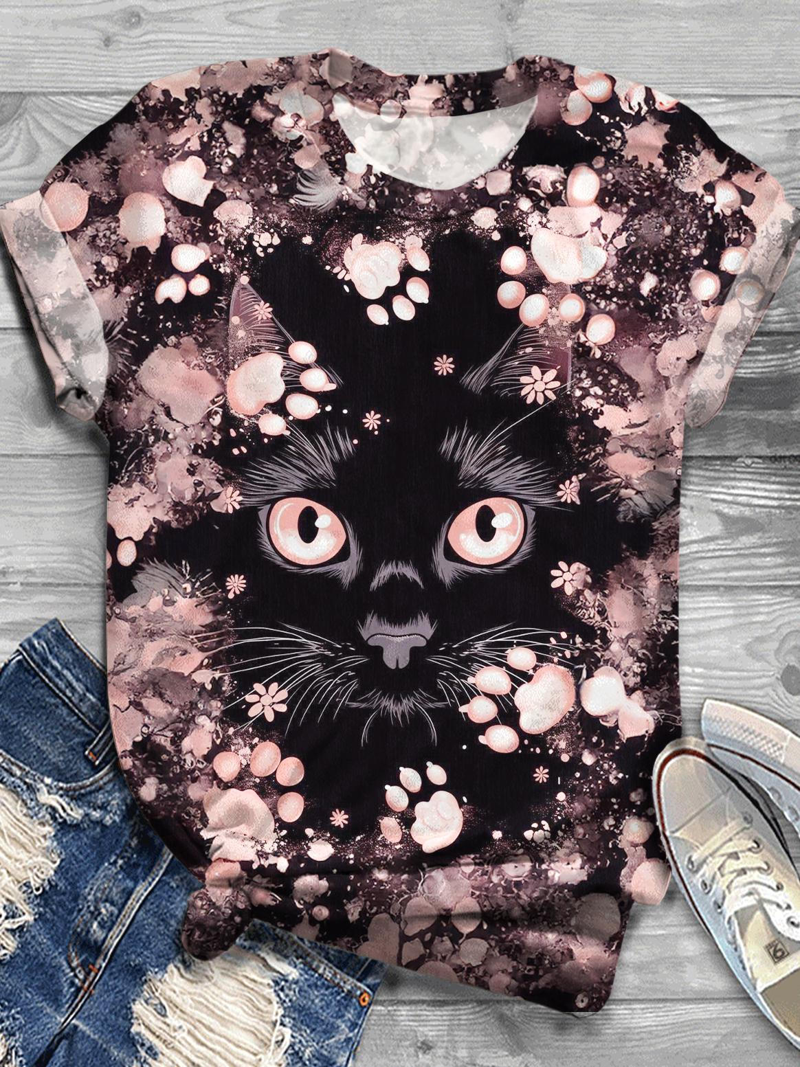 Cute Kitten And Flower Printed Crew Neck T-shirt
