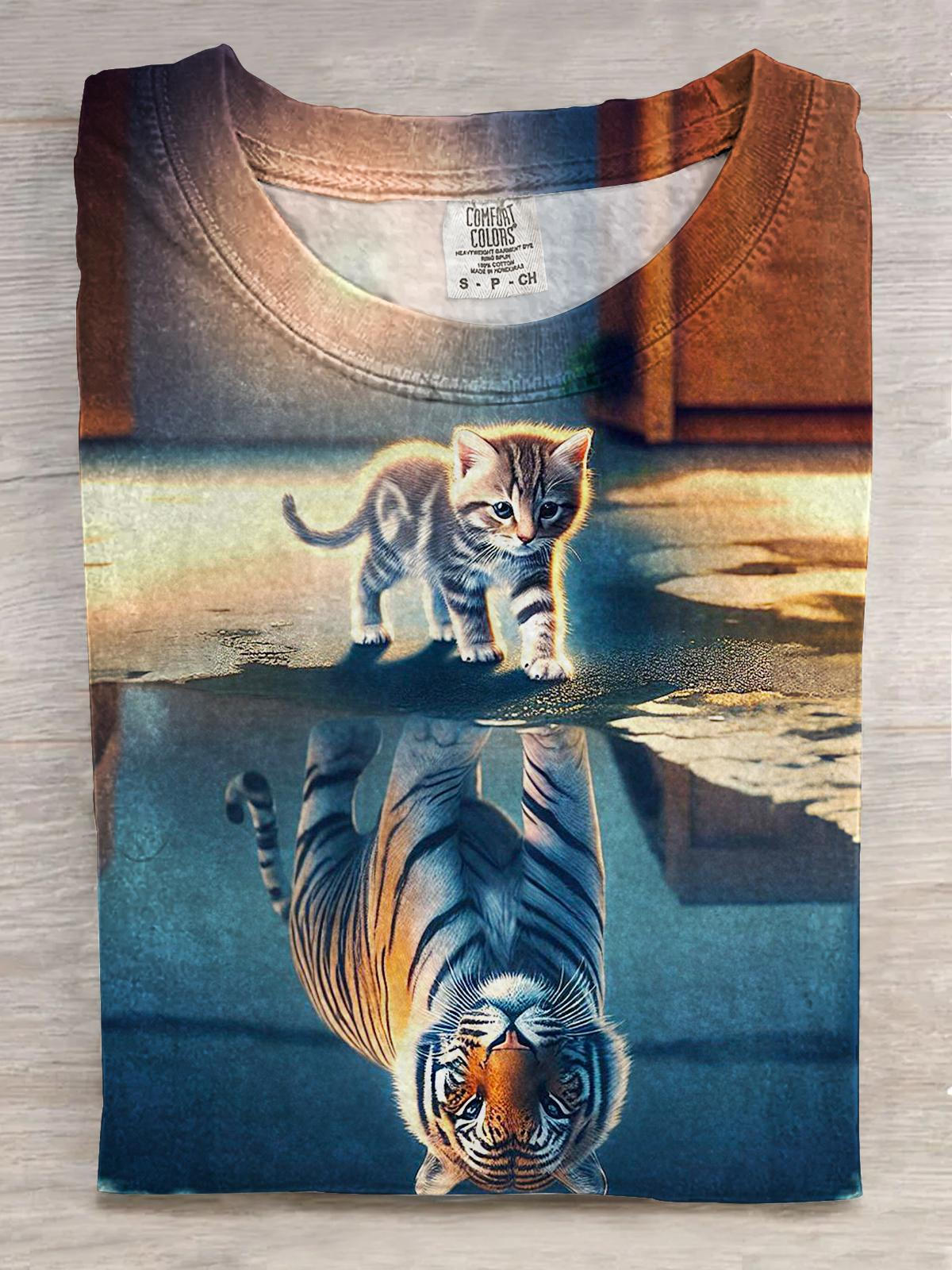 Cute Kitten Funny Reflection Print Crew Neck T-shirt
