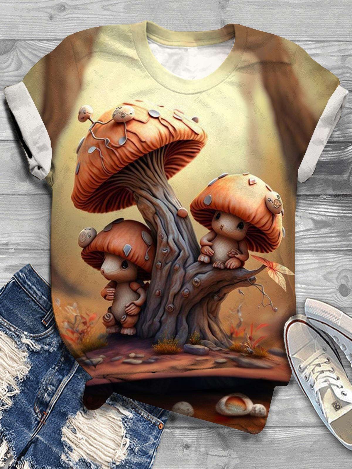 Cute Mushroom Print Crew Neck T-shirt