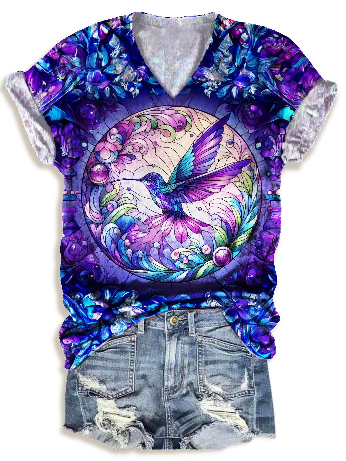 Dreamy Stained Glass Hummingbird V-neck T-Shirt