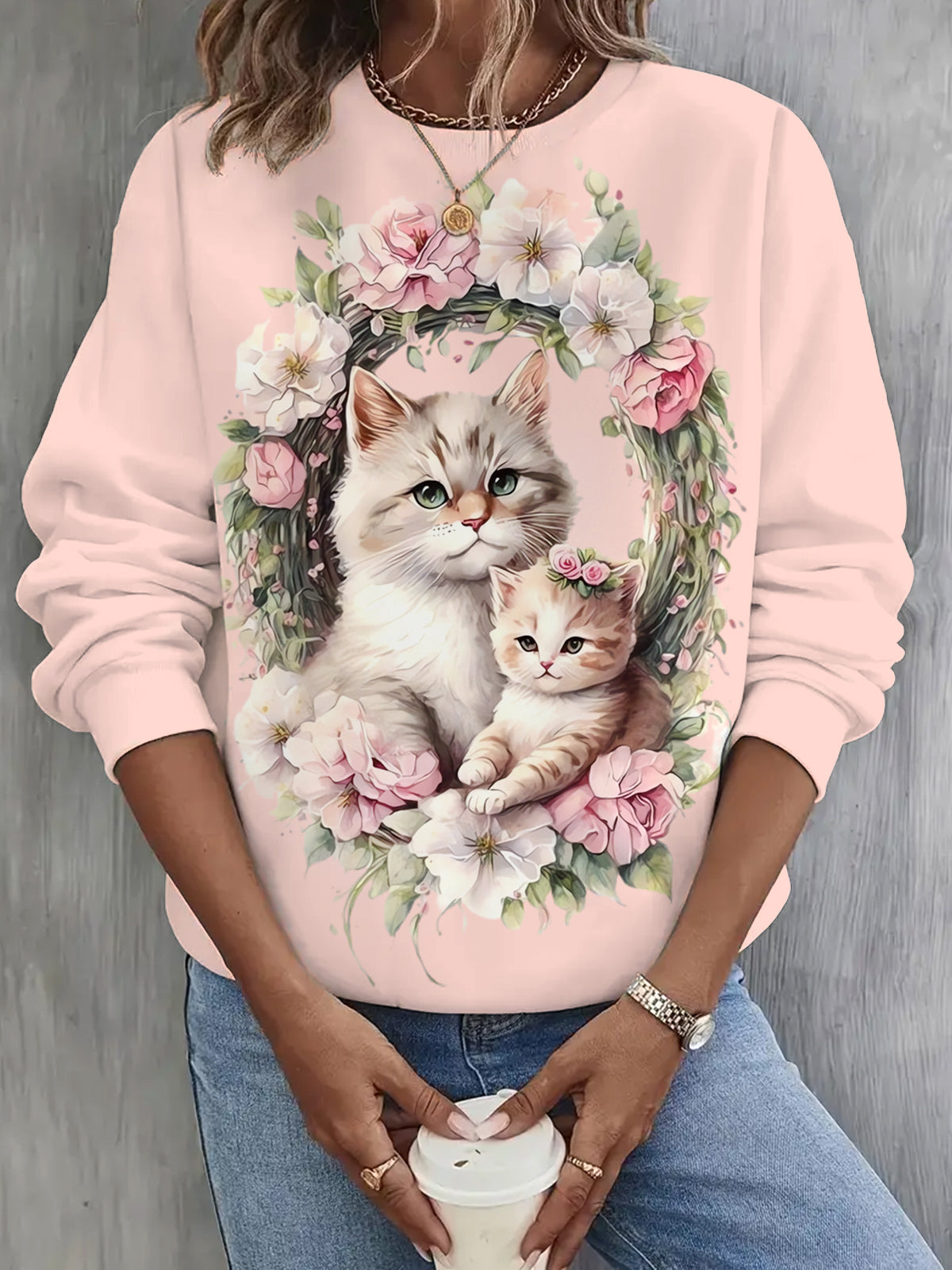 Floral And Cute Cat Print Long Sleeve Casual Top