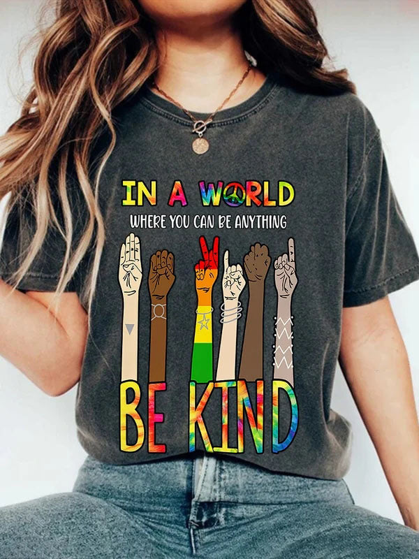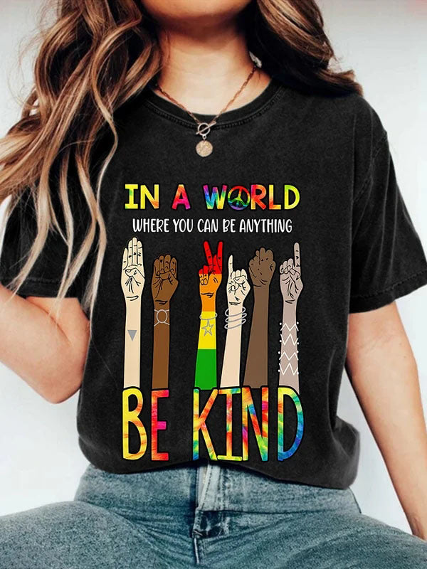 Retro Hippie In A World Where You Can Be Anything Be Kind Print T-Shirt