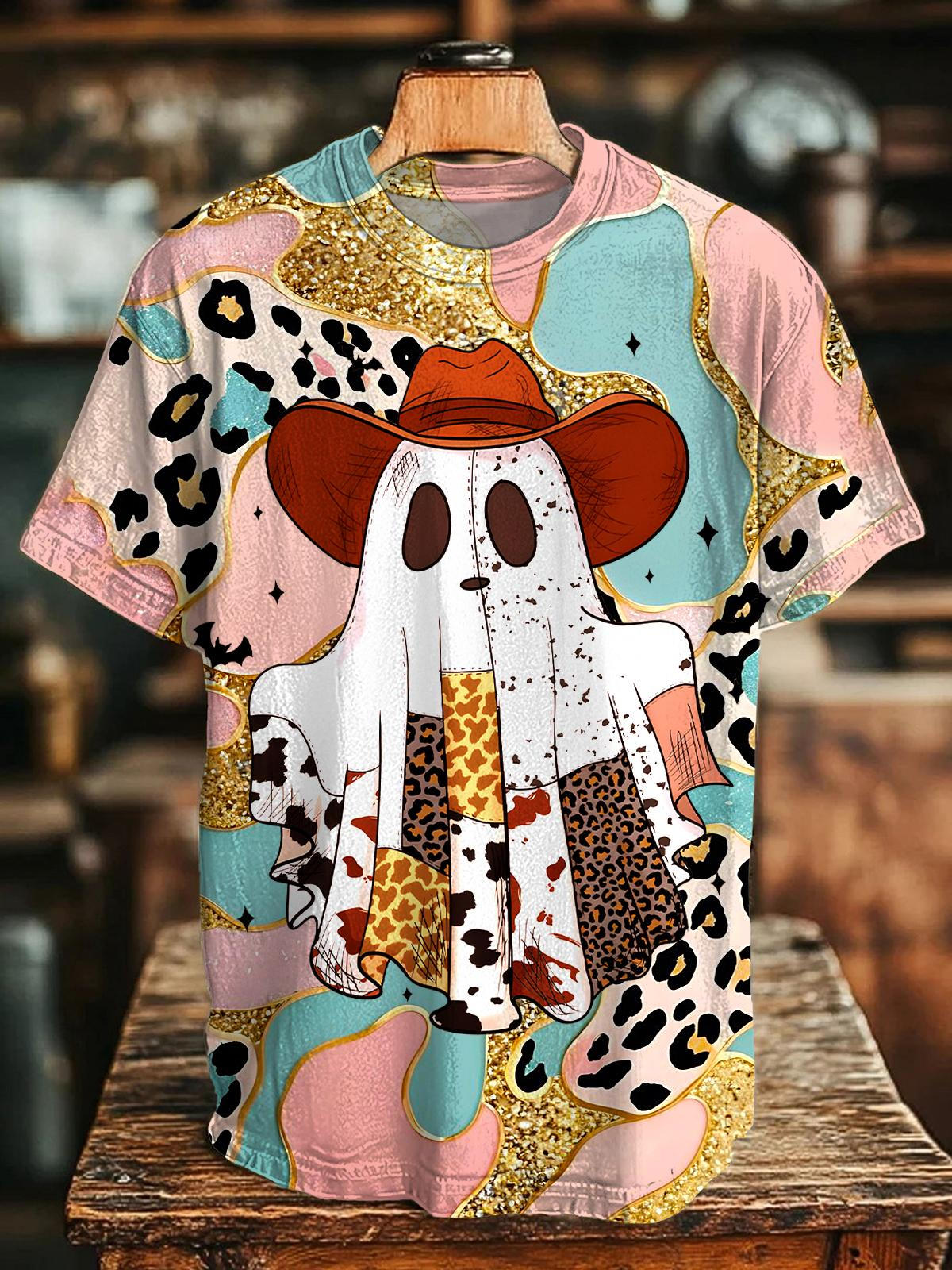 Halloween Denim Ghost Print Crew Neck T-shirt