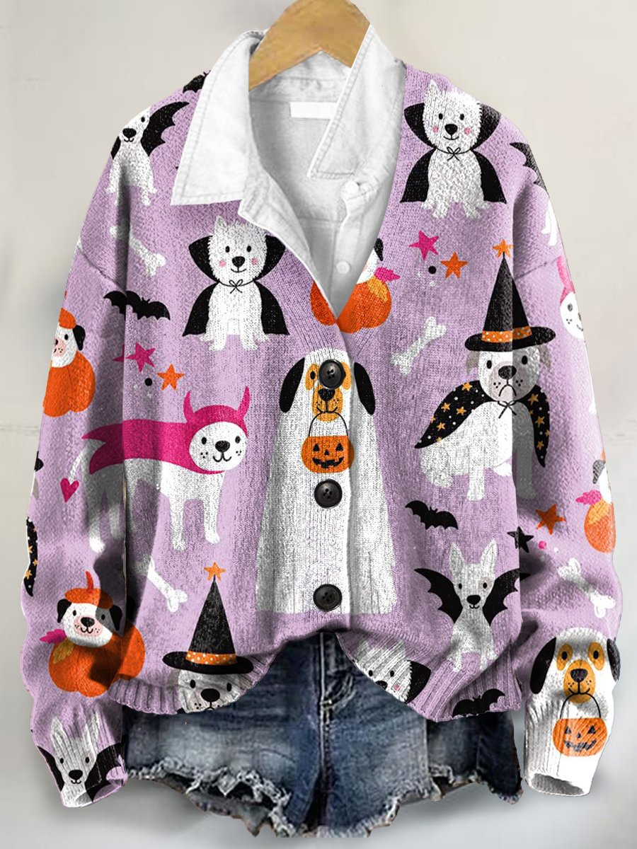 Halloween Dog Art Print Buttoned V-neck Cardigan Sweater