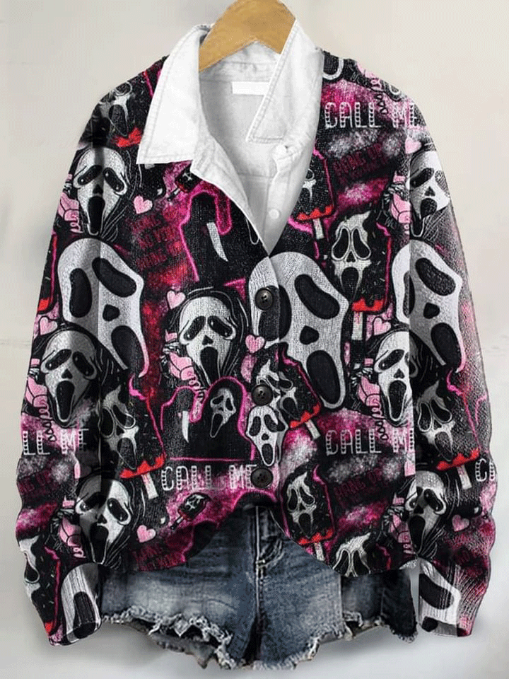 Halloween Horror Art Print Buttoned V-neck Cardigan Sweater