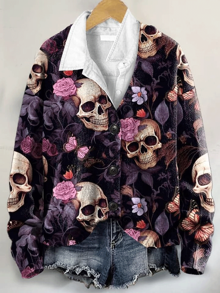 Halloween Skeleton Art Print Buttoned V-neck Cardigan Sweater