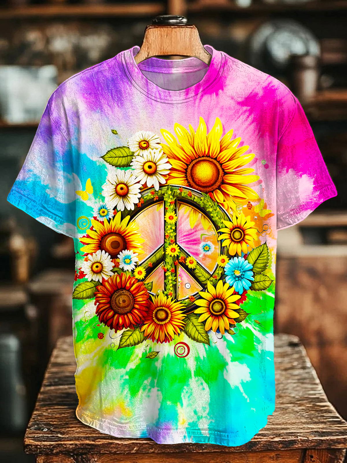 Hippie Daisy Sunflower Love And Peace Art Crew Neck T-shirt