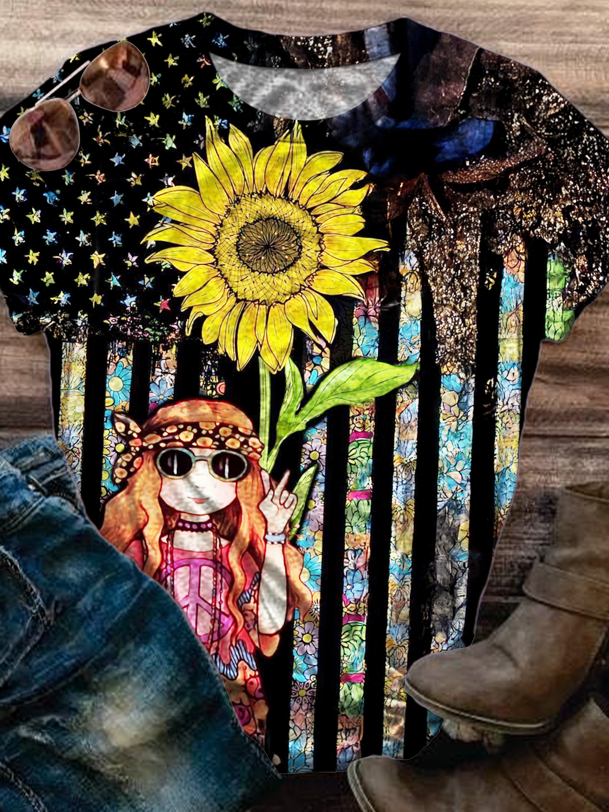 Hippie Love and Peace Sunflower Art Crew Neck T-shirt