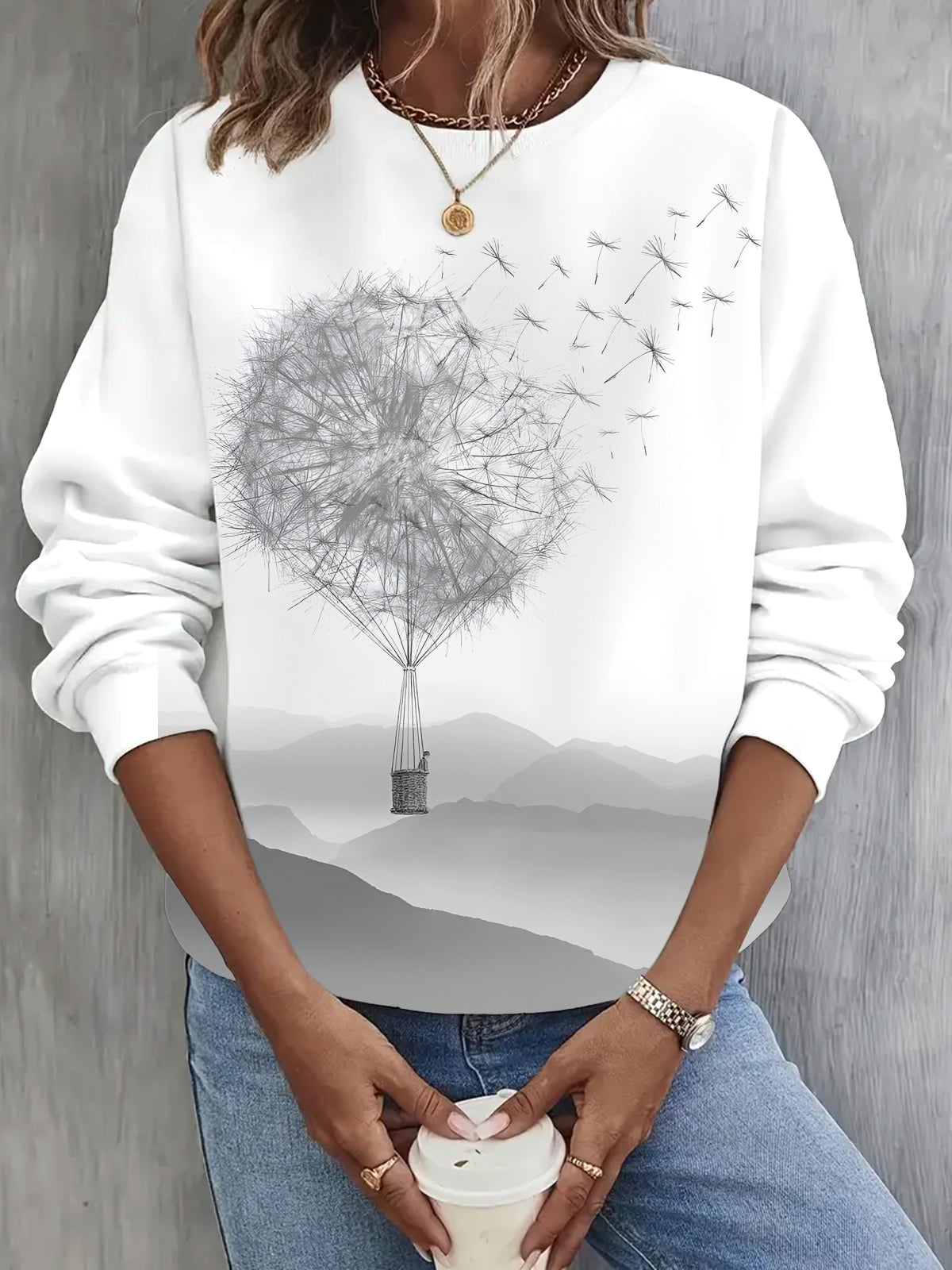 Hot Air Balloon Dandelio Print Long Sleeve Casual Top