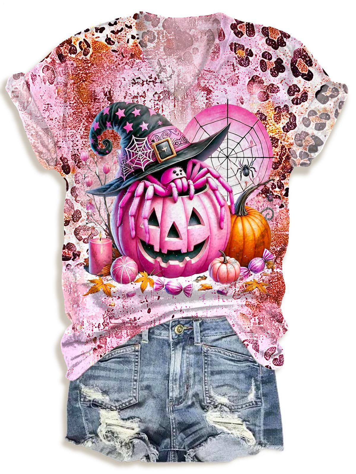 Leopard Print Devil Pumpkin Halloween V-neck T-Shirt