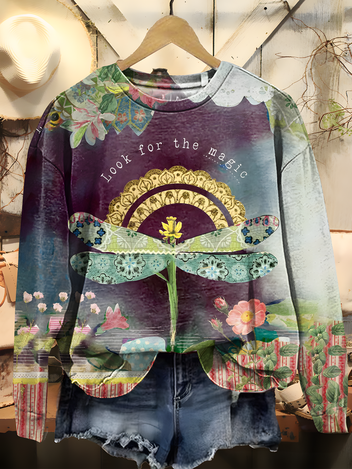 Look For The Magic Dragonfly Flower Art Printed Long Sleeve Casual Top