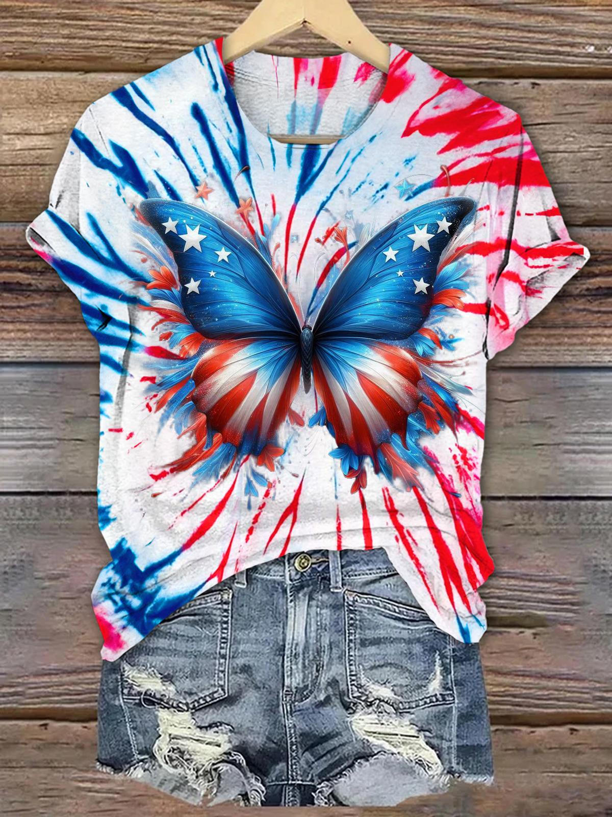 Red White & Blue Tie Dye Butterfly Crew Neck T-shirt
