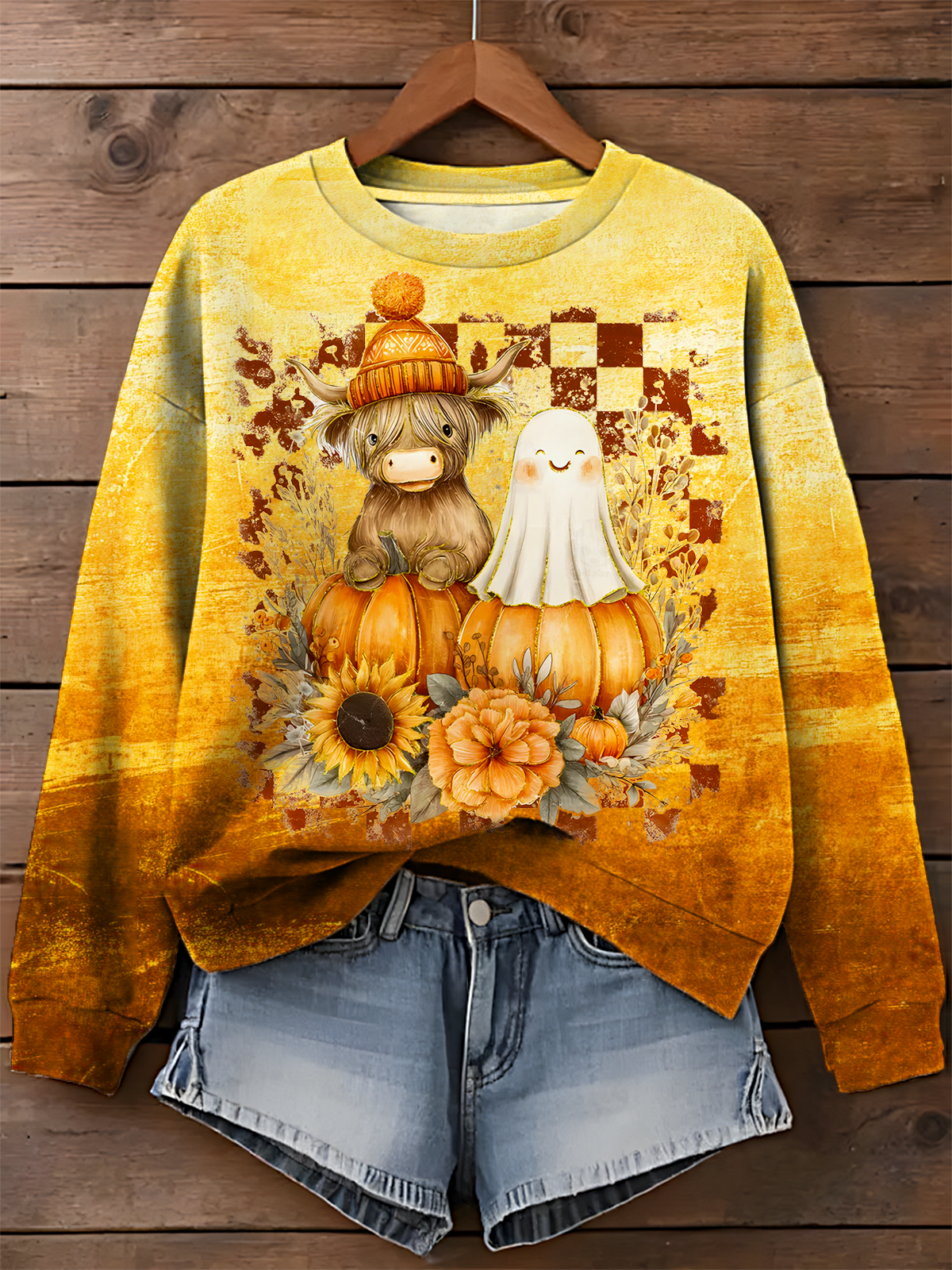Retro Cute Fall Highland Cow Ghost Printed Long Sleeve Casual Top