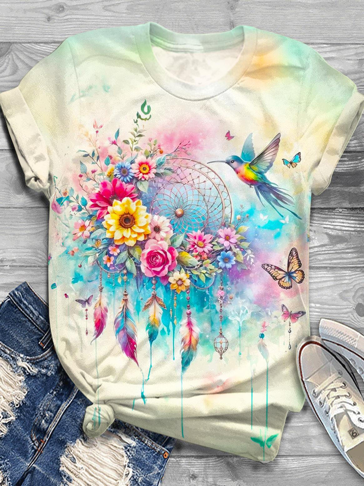 Retro Flowers And Hummingbird Printed Crew Neck T-shirt