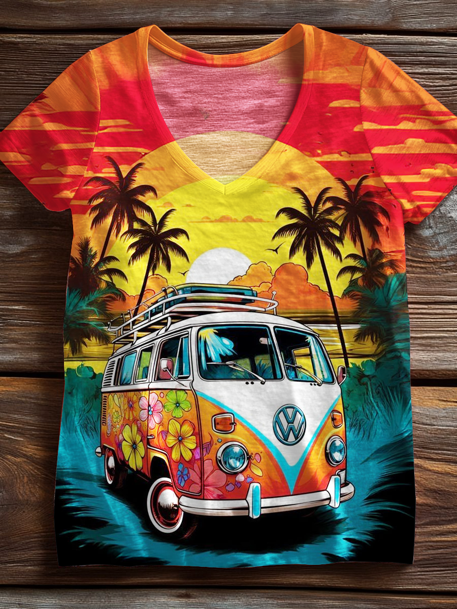 Retro Hippie Sunset Van Art V-neck T-Shirt