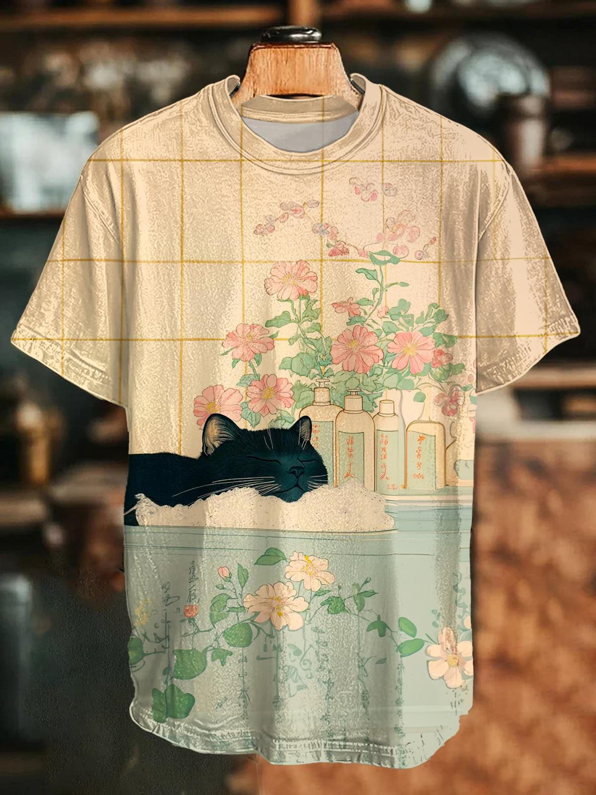 Retro Kitten And Flowers Printed Crew Neck T-shirt