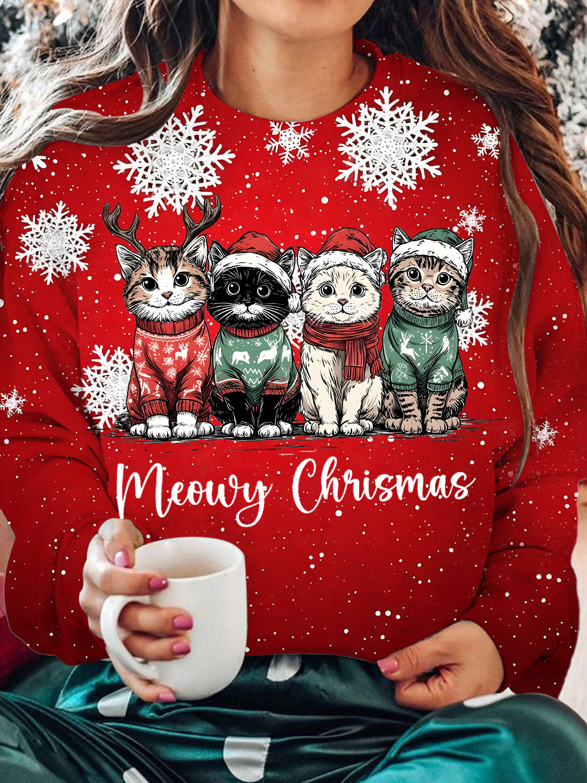 Retro Meowy Christmas Printed Long Sleeve Casual Top