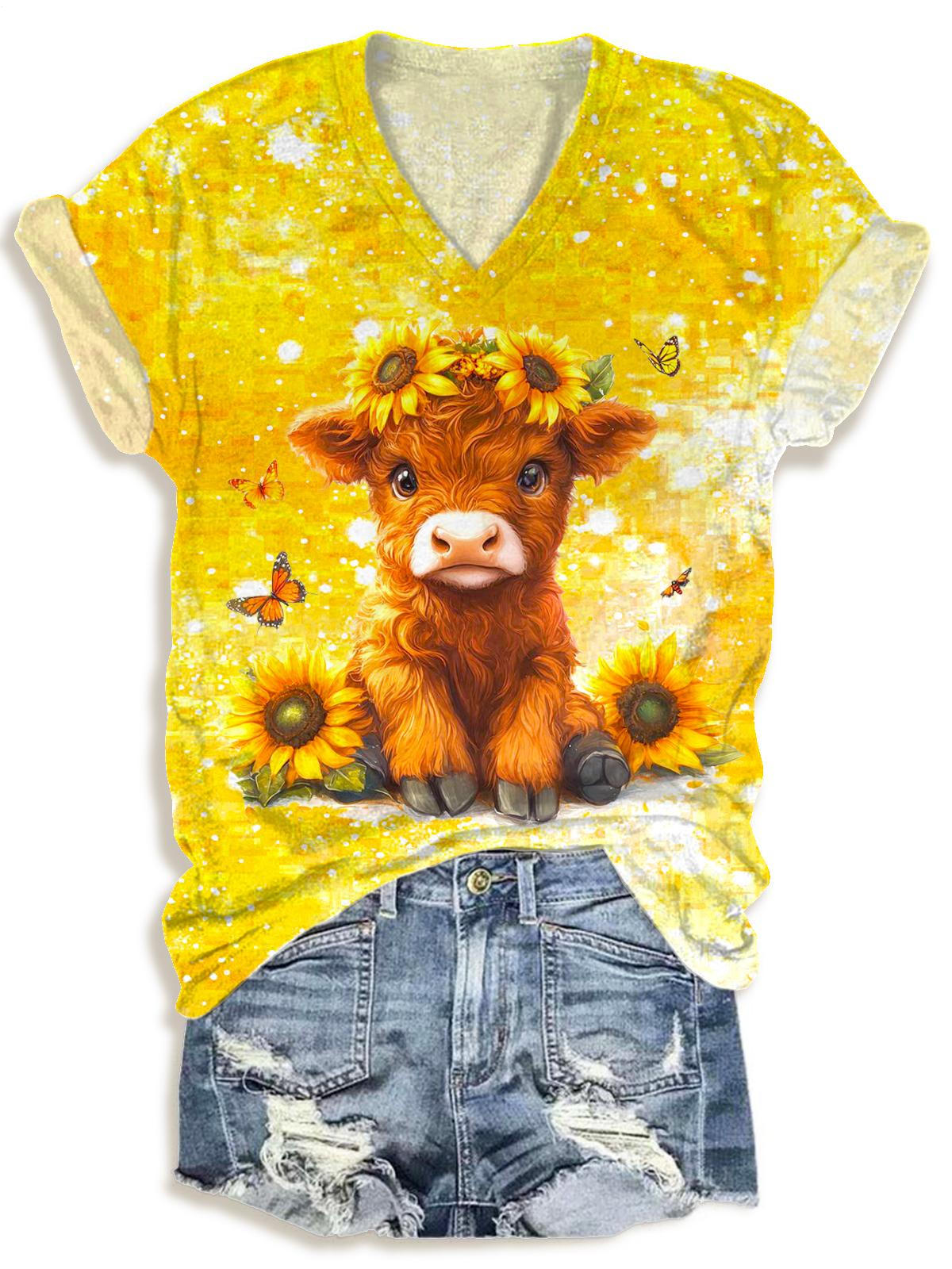 Retro Sunflower Cute Highland Cow V-neck T-Shirt