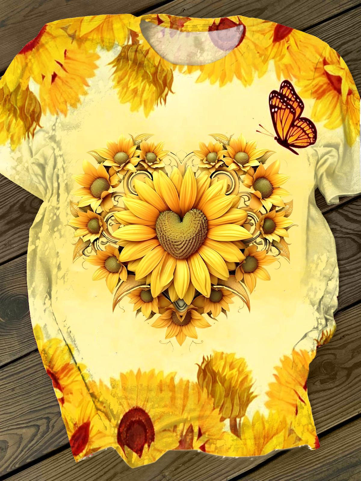 Retro Sunflower Heart Print Crew Neck T-shirt