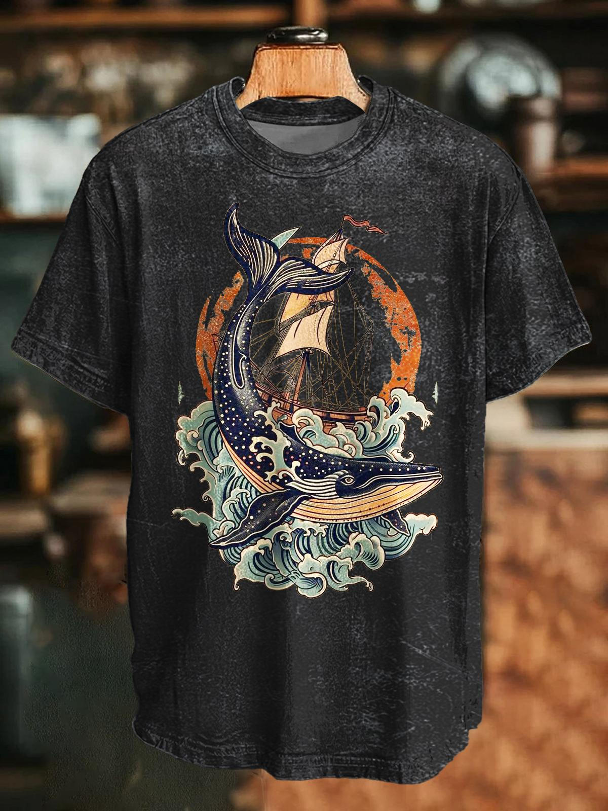 Retro Whale Printed Crew Neck T-shirt