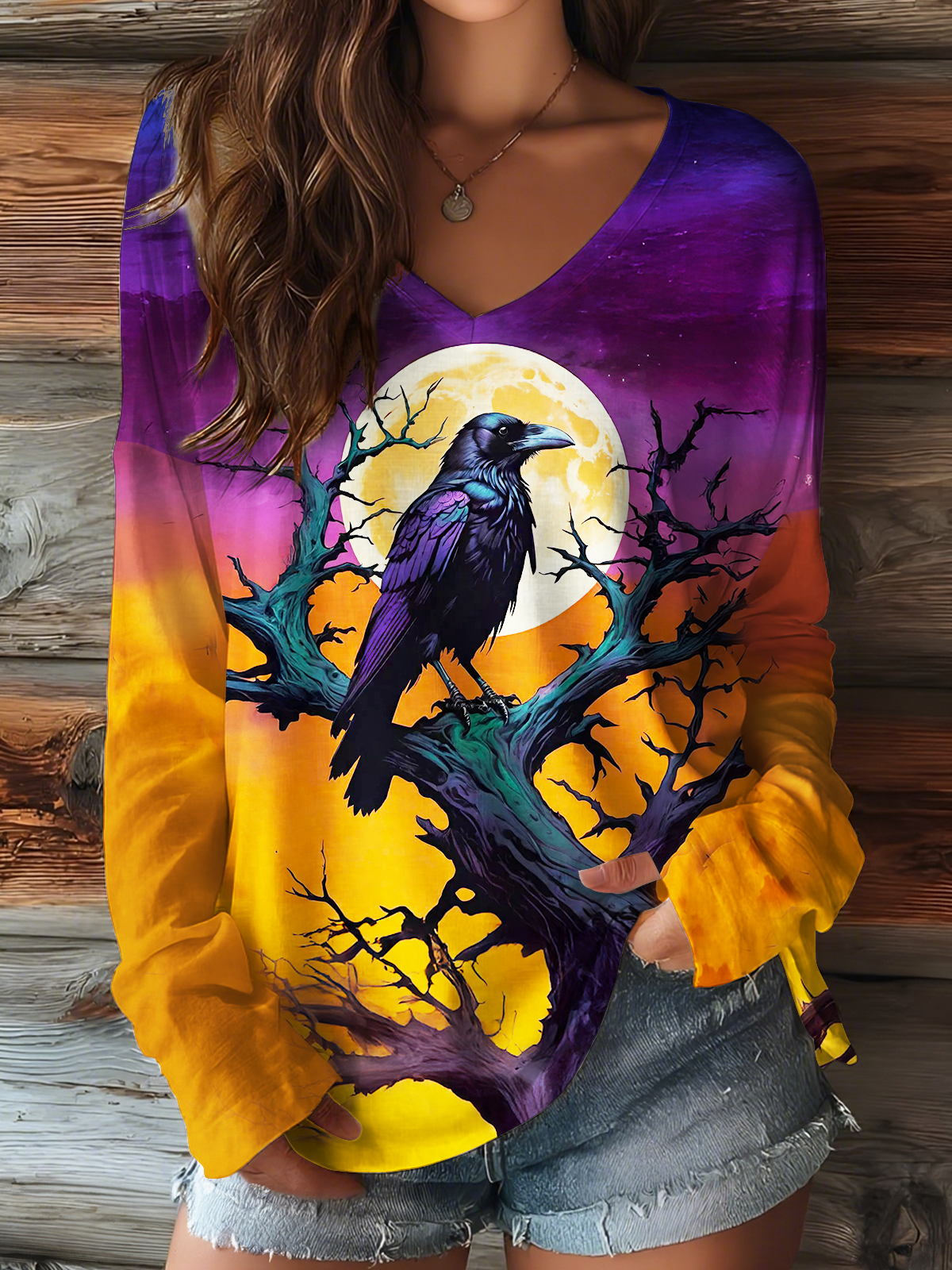 Scary Halloween Crow V-neck Long Sleeve Top