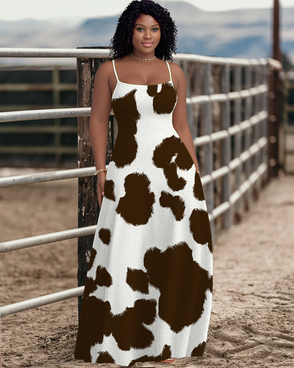Sling Western Style Yak Print Pocket Maxi Dress