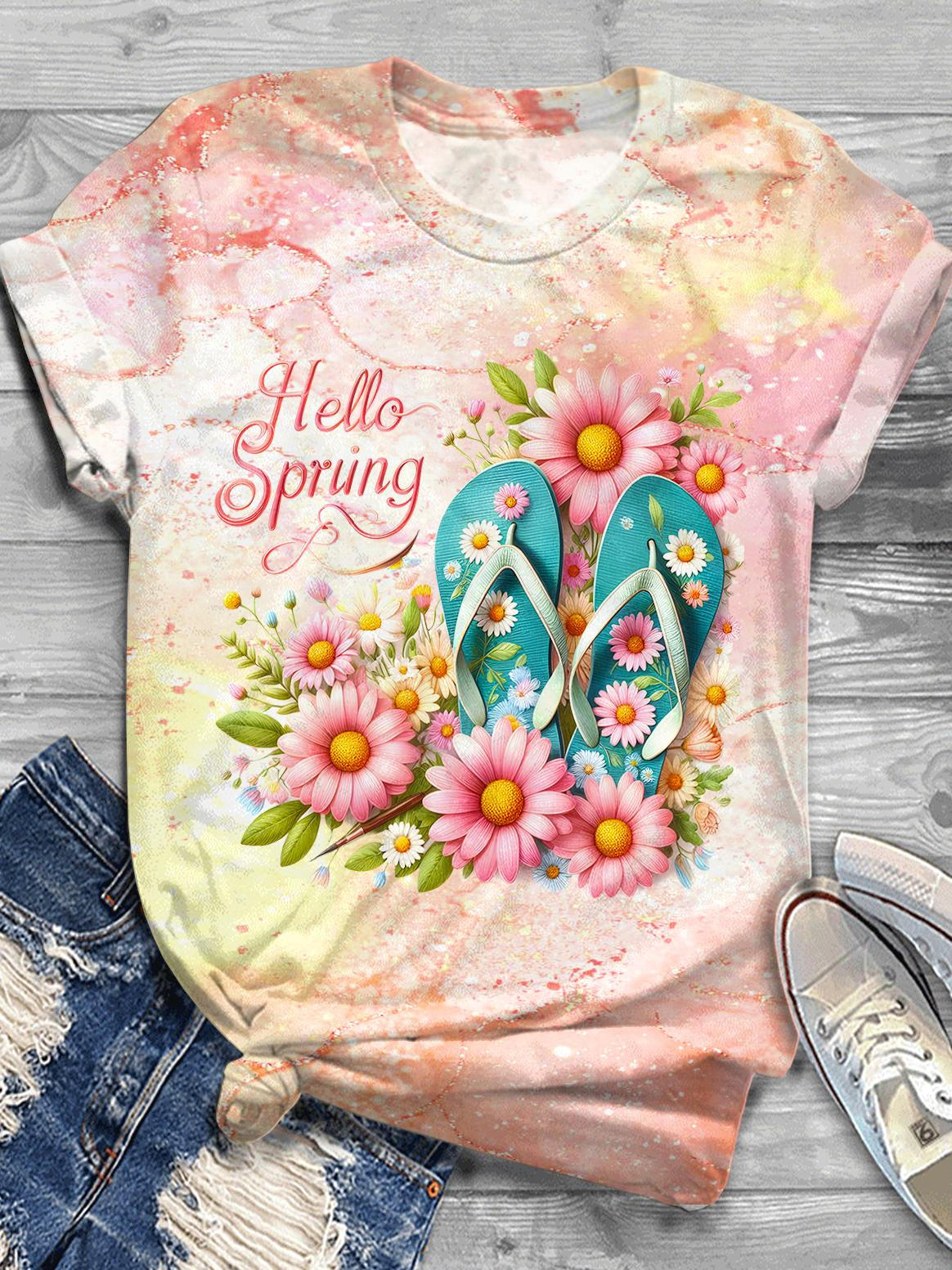Spring Flower Printed Crew Neck T-shirt