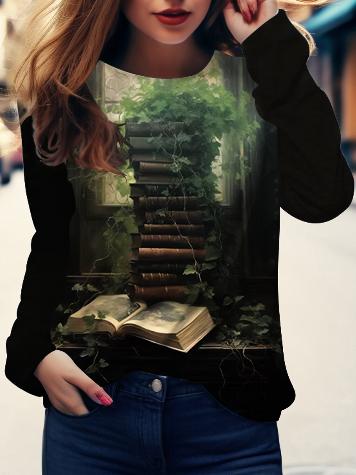 Vintage Botanical Book Print Round Neck Long Sleeve Top