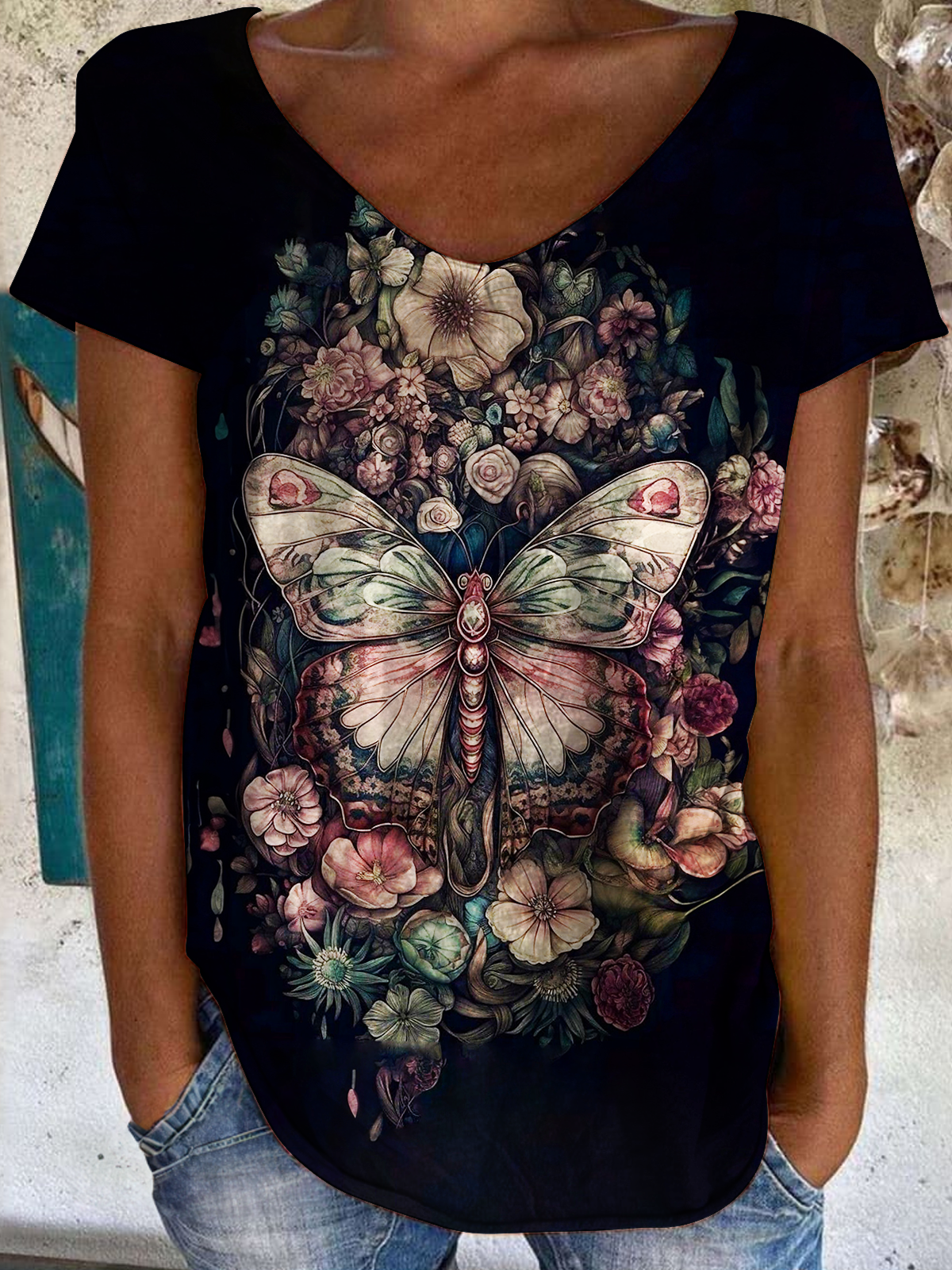 Vintage Flowers Butterfly Art Ladies V Neck Tops