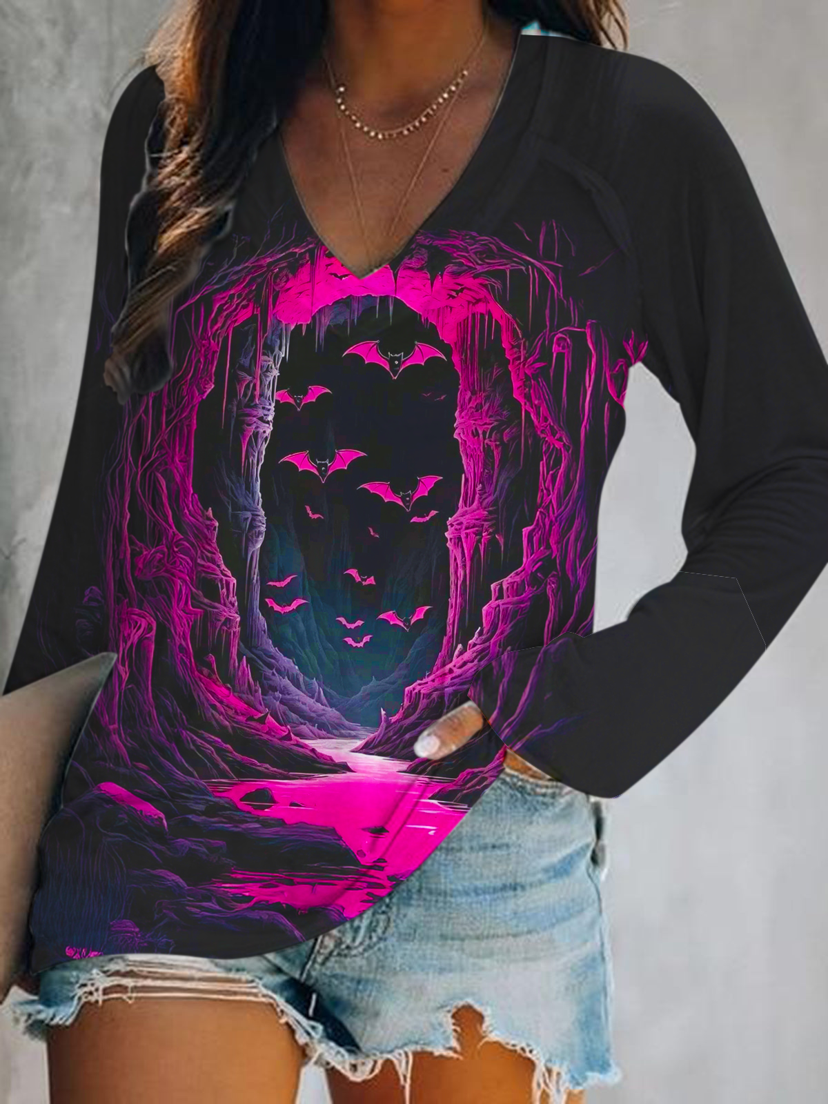 Vintage Halloween Bat Print V-Neck Long Sleeve Top