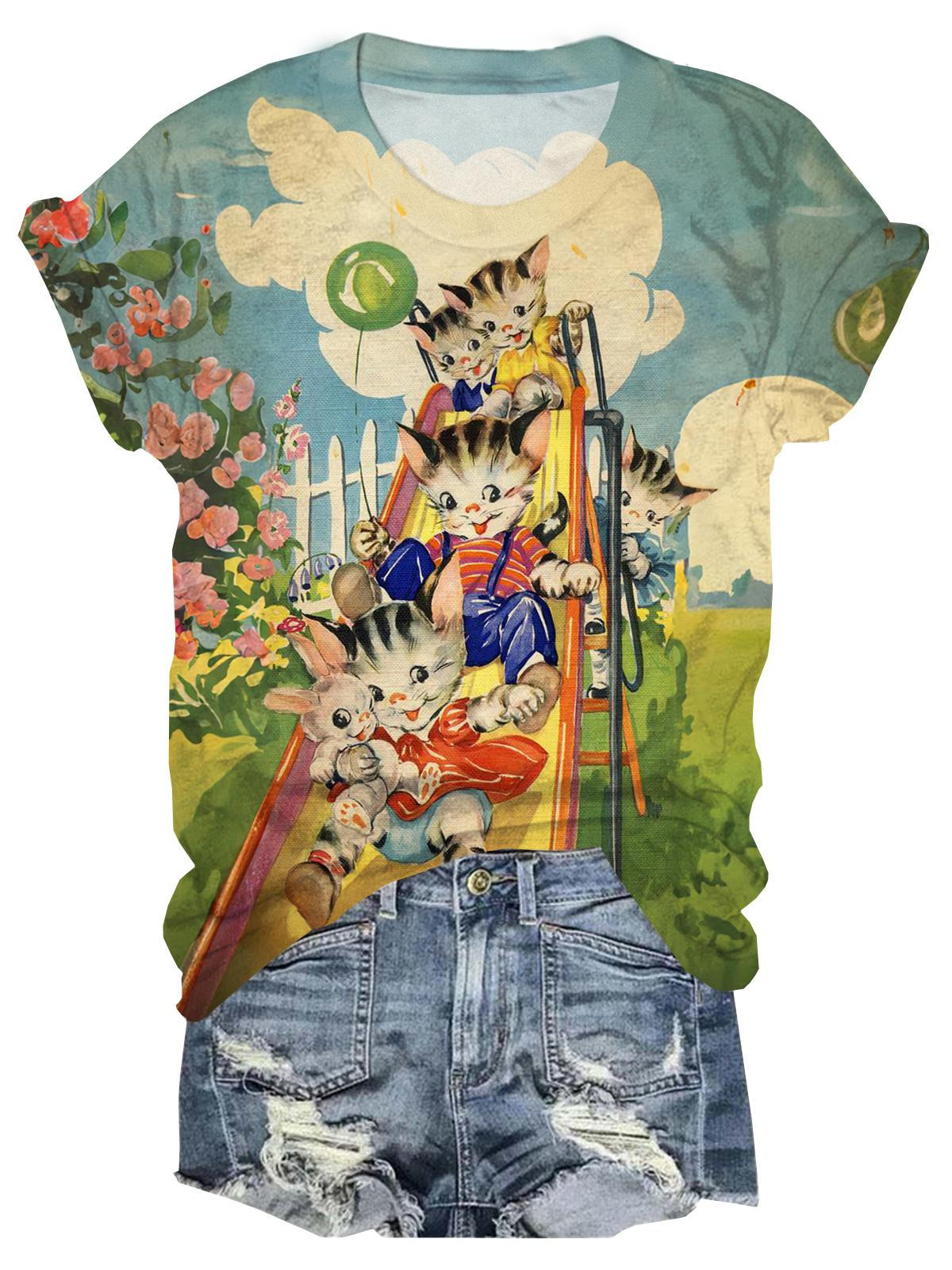 Vintage Playing On Slide Kittens Crew Neck T-shirt