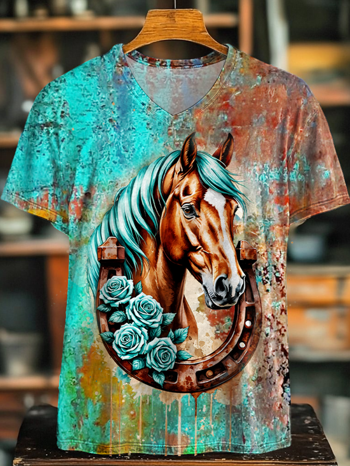 Vintage Western Floral Horseshoe Art V-neck T-Shirt