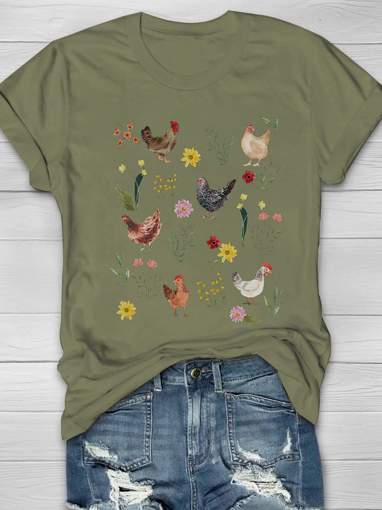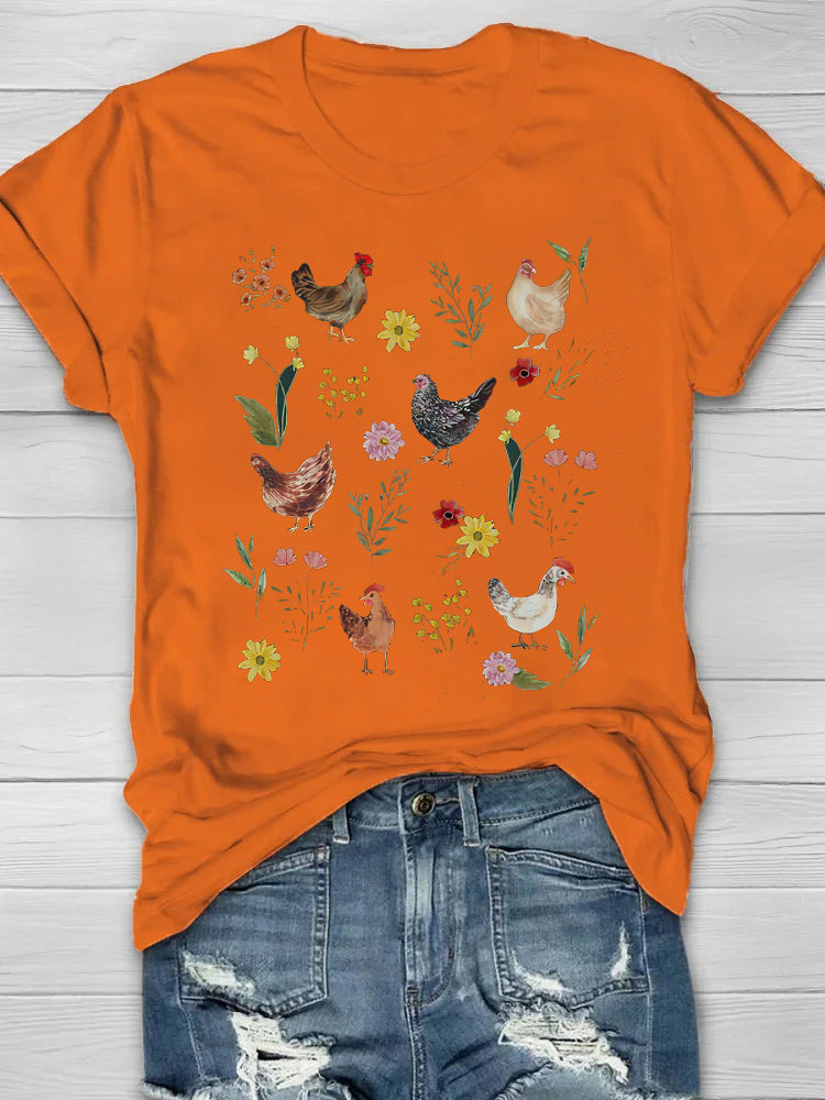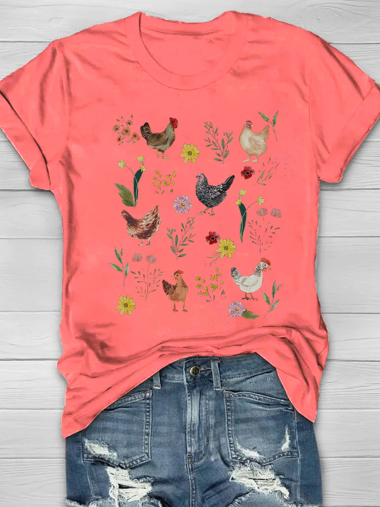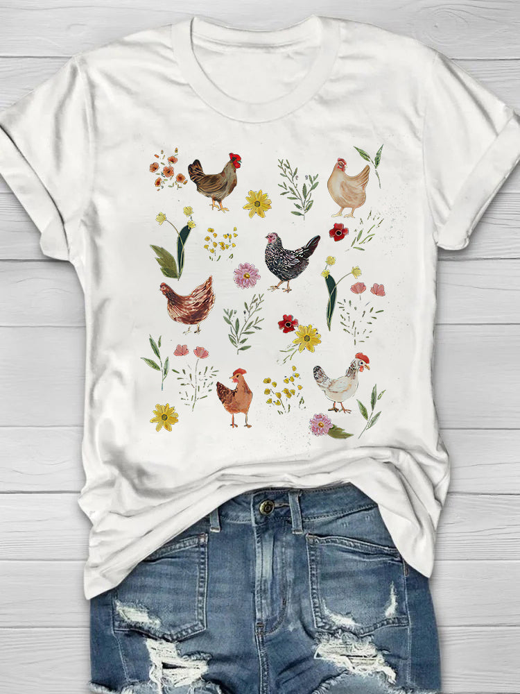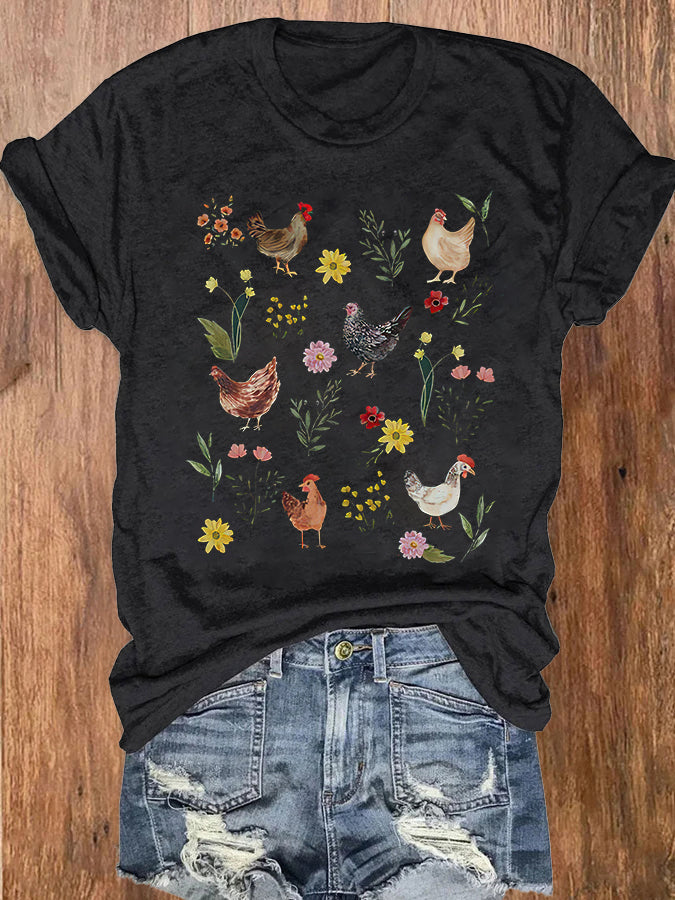 Wild Flower Chicken Printed Crew Neck T-shirt