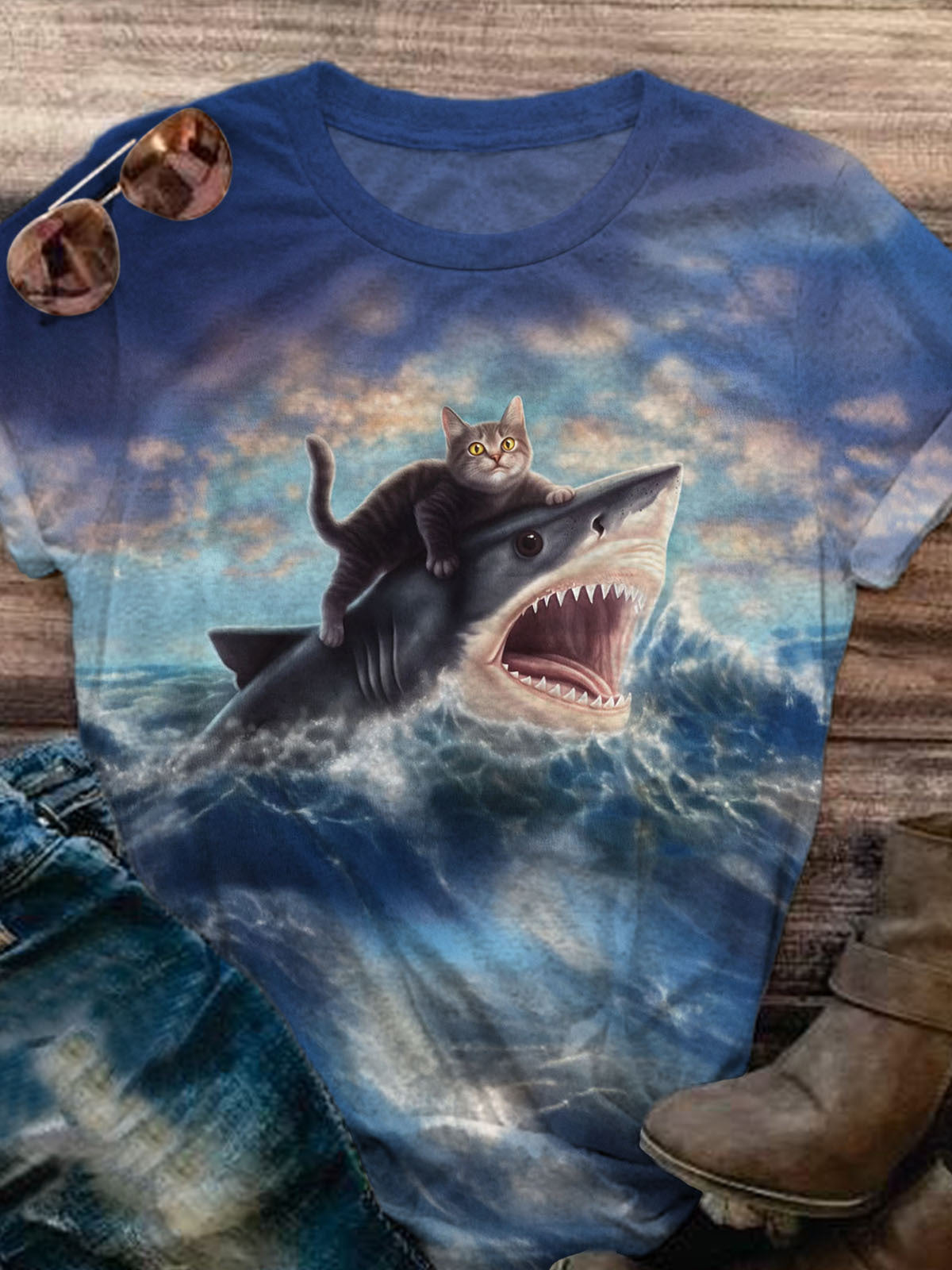 Women's Adventure Cat Shark Creative Print Casual T-shirt