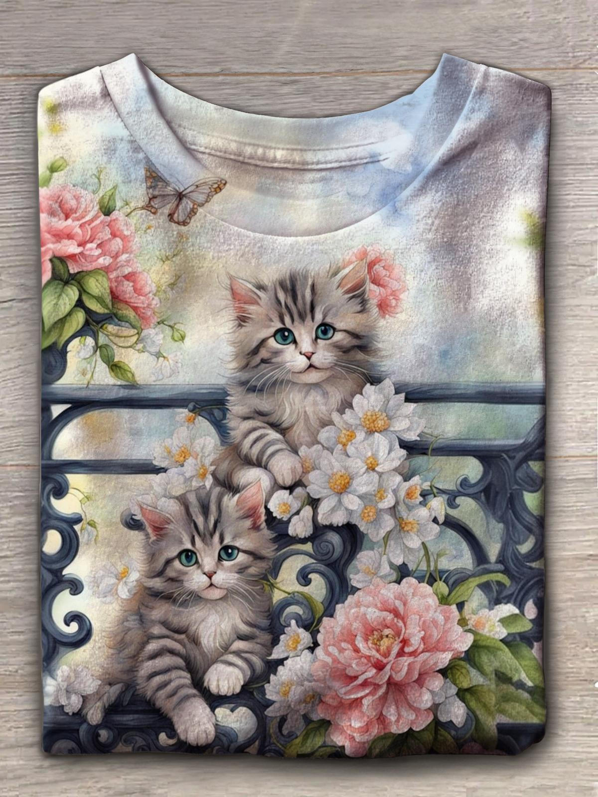 Women's Cute Cat Floral Retro Crew Neck T-shirt