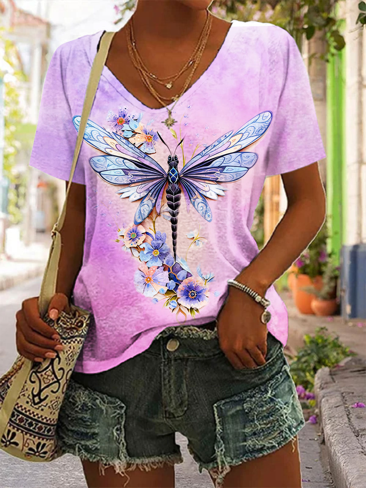 Women's Floral Dragonfly Print V-Neck Top