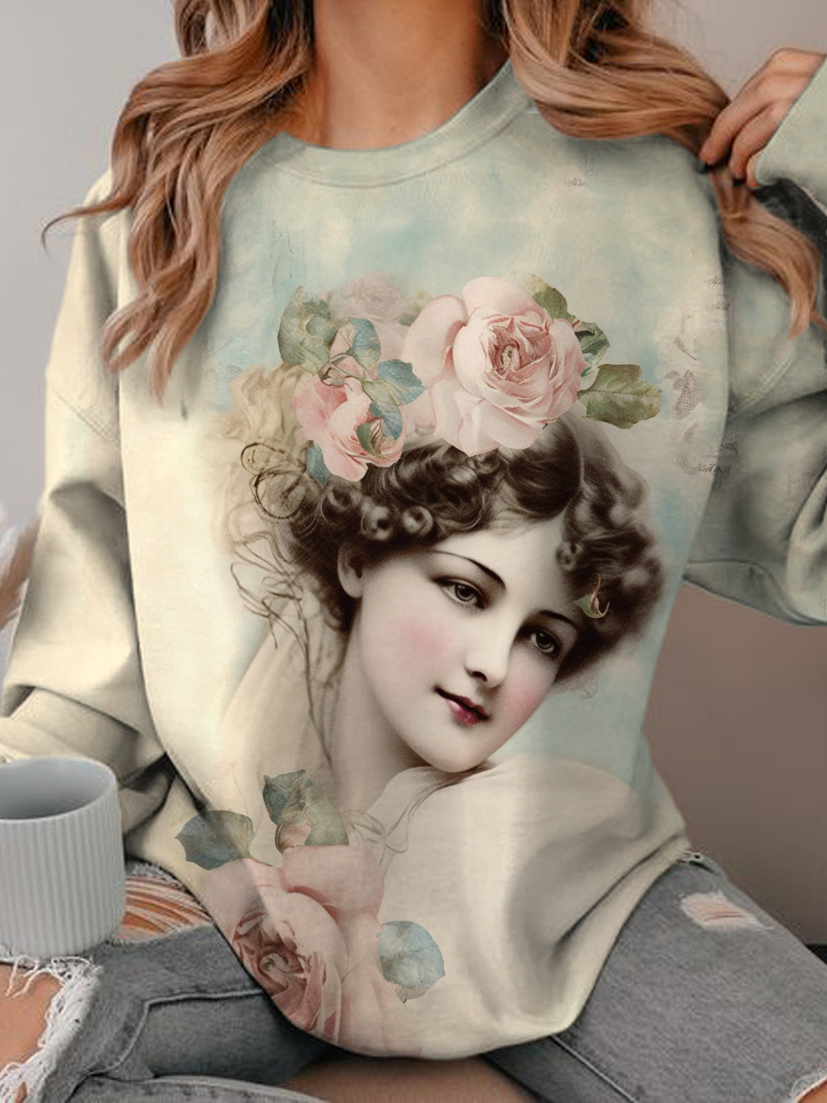 Women's Retro Portrait Print Round Neck Long Sleeve Top