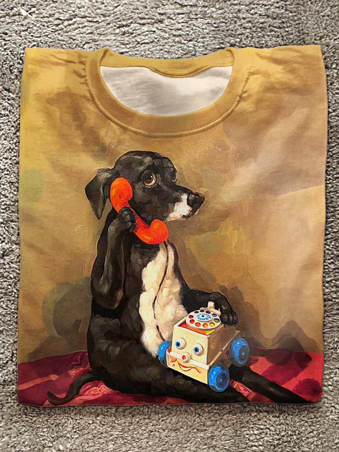 Women's Retro Telephone Puppy Print Crew Neck Short Sleeve T-Shirt