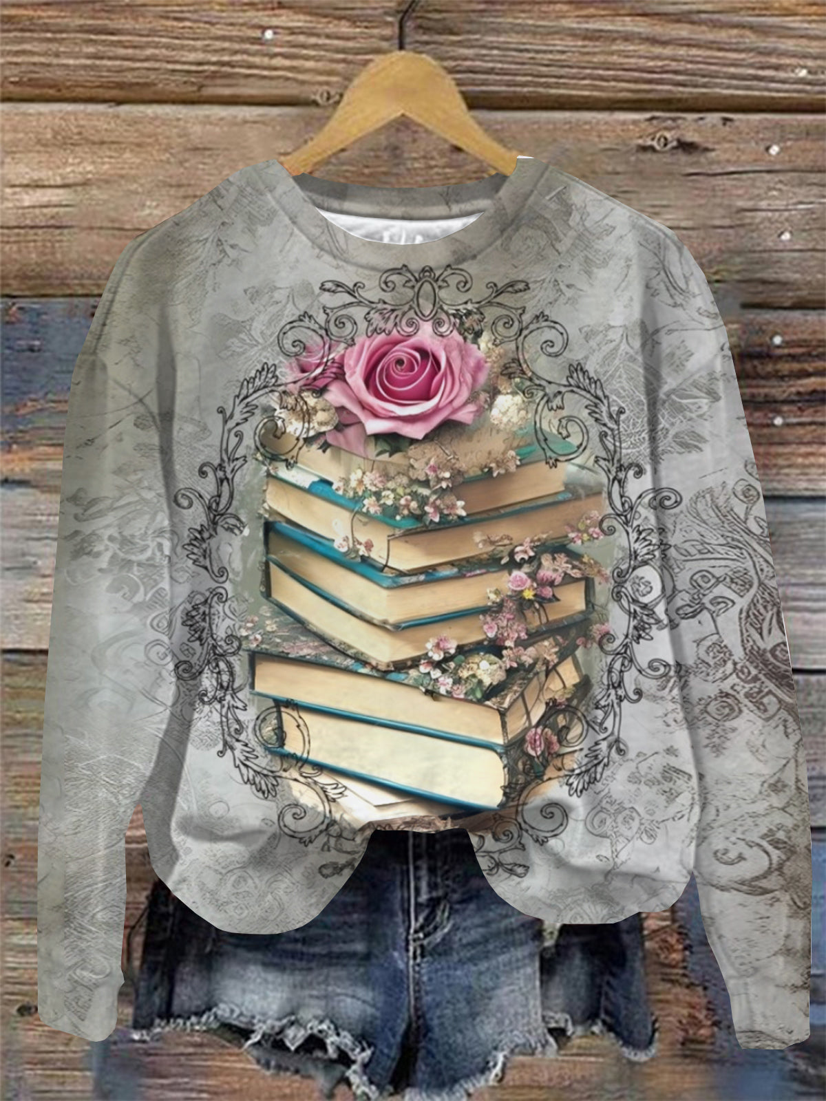Women's Vintage Book Print Round Neck Long Sleeve Top