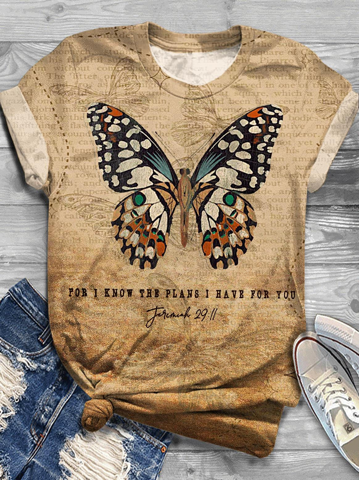 Women's Vintage Christian Jesus Butterfly Christian Print Crew Neck T-shirt