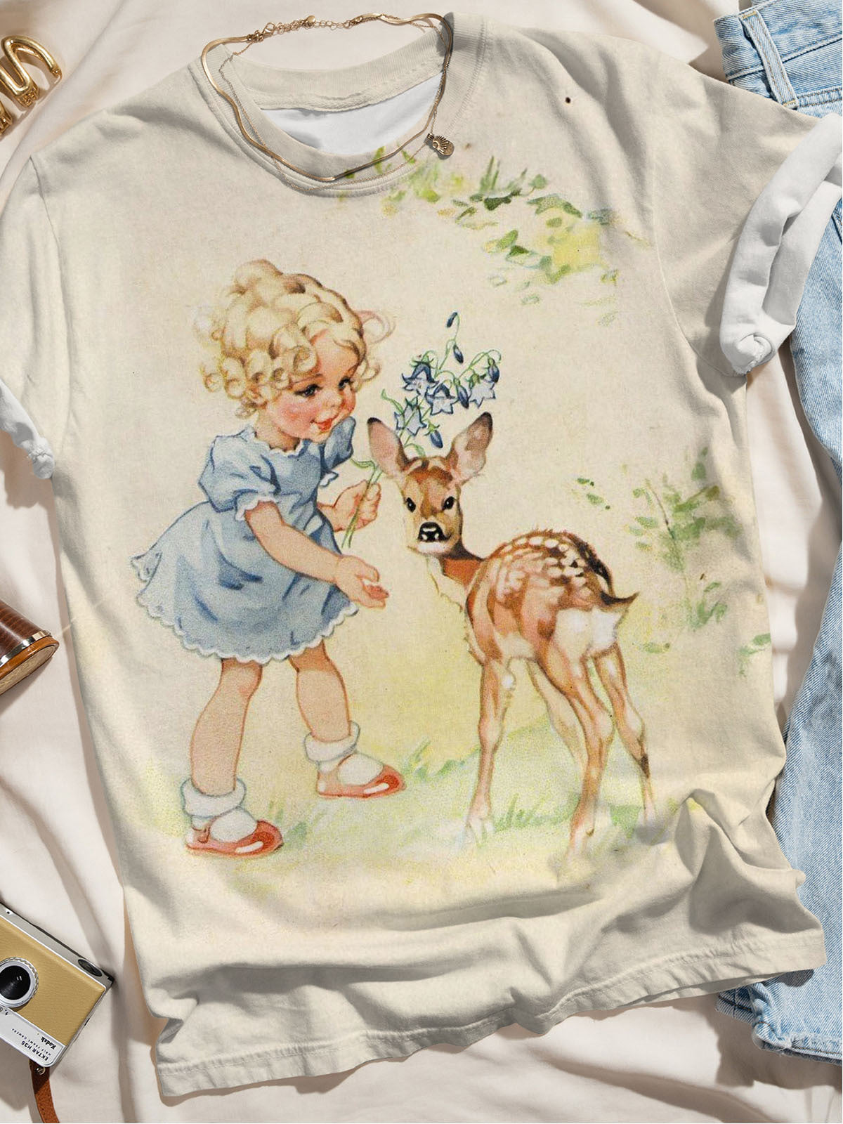 Women's Vintage Elk Girls Prairie Print Casual T-Shirt