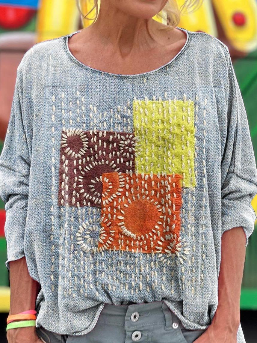 Women's Vintage Flower Pattern Splicing Art Print T-shirt