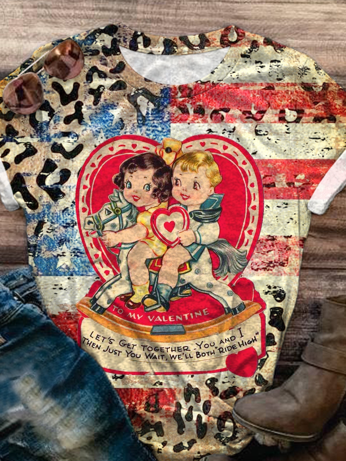 Women's Vintage Valentine's Day Love Flag Print Casual T-Shirt